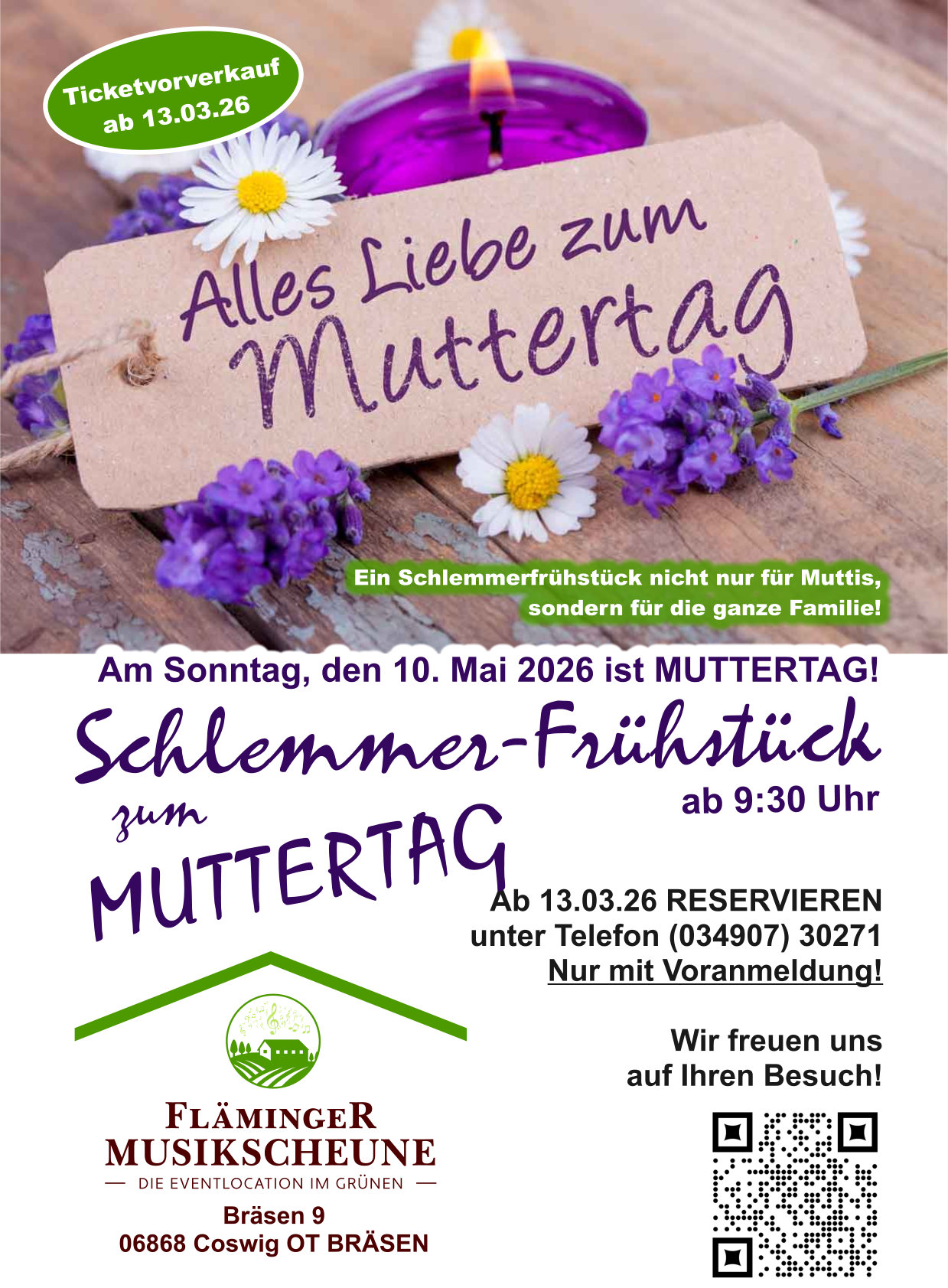 Schlemmerfrühstück zum Muttertag ACHTUNG!!!Limiterter Kartenverkauf! TICKETVORVERKAUF startet am 13.03.2026! Tickets nur mit Vorbestellung über den örtlichen Veranstalter unter: Telefon / Whats App (034907) 30371