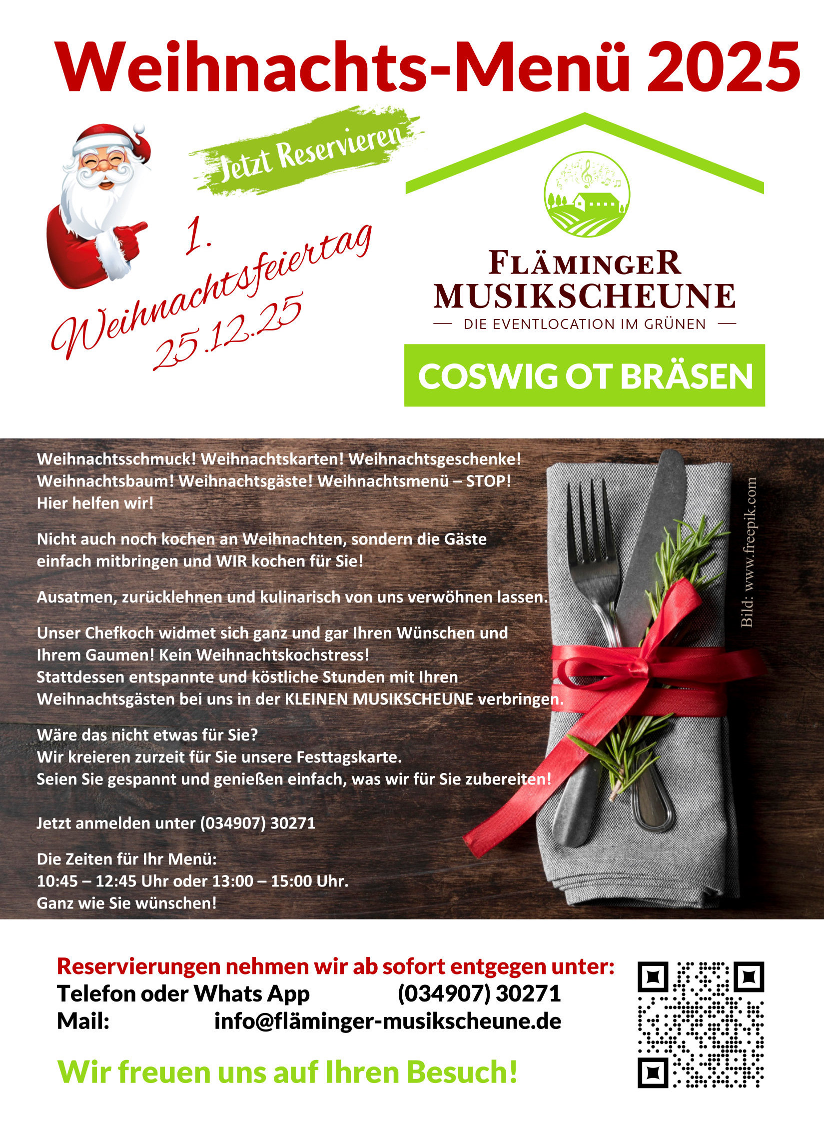Weihnachtsessen Weihnachtsmenü am 1. Weihnachtsfeiertag Nur mit Vorbestellung!Wenige Restplätze in der zweiten Tischzeit ab 13 Uhr Reservierungen unter (034907) 30271